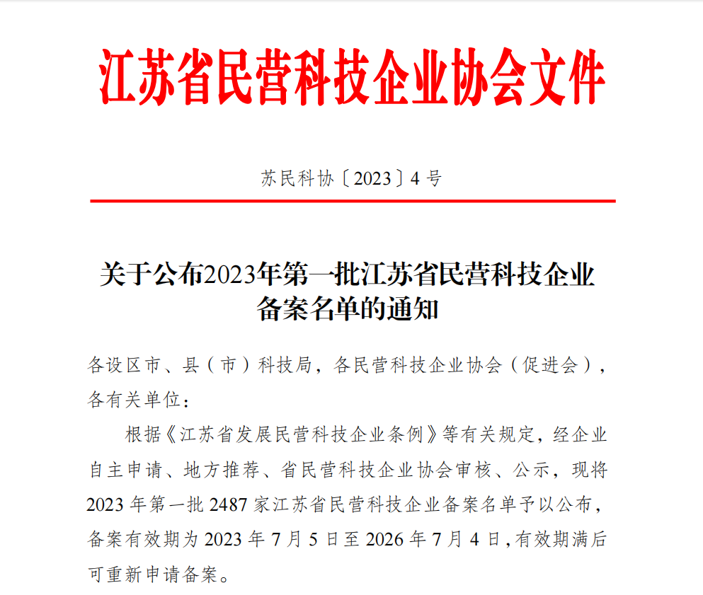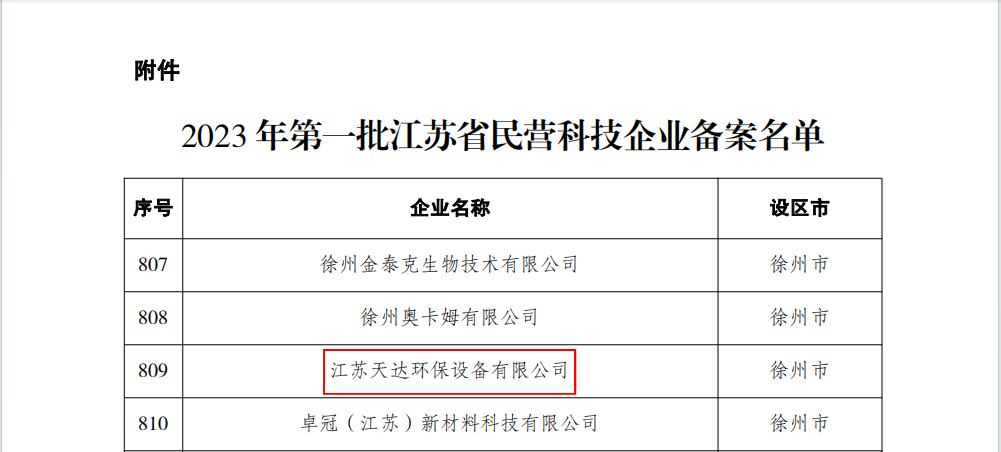 導(dǎo)讀:近日,江蘇省民營(yíng)科技企業(yè)協(xié)會(huì)公布了2023 年第一批江蘇省民營(yíng)科技企業(yè)備案名單。經(jīng)江蘇省民營(yíng)科技企業(yè)協(xié)會(huì)的審查與認(rèn)定,江蘇天達(dá)環(huán)保設(shè)備有限公司獲得“江蘇省民營(yíng)科技企業(yè)”榮譽(yù)稱號(hào)。